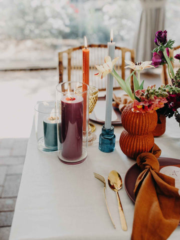 For events, elevate the ambience by clustering various heights of pillar candles in complementary colours on tables or along walkways for a sophisticated touch. At home, create a cosy atmosphere by arranging slim pillar candles in decorative holders on mantels or side tables, infusing your living space with warmth and style.