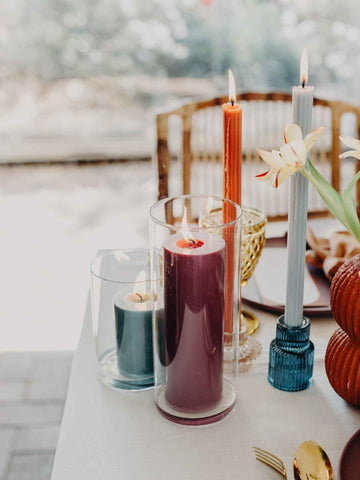 - Glassware: Adding candles into glassware, such as a glass cylinder or sleeve, affects burn time due to the added heat and trapped hot air. Burning a candle in too small glassware may cause rapid burning, dripping, or pooling.