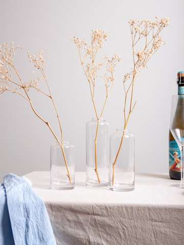 Available in three elegant heights, the Clear Louisa Glass Bud Vase features a sleek cylindrical shape with a narrow neck—perfectly designed to showcase a single bloom or a small cluster of stems.