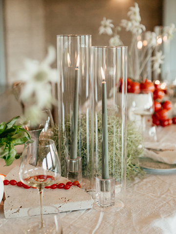 Pair with dinner or taper candles and holders to ensure that the candle flames remain comfortably within the glass sleeve.