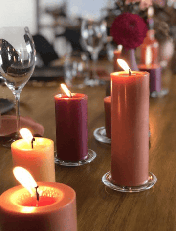 - Glassware: Adding candles into glassware, such as a glass cylinder or sleeve, affects burn time due to the added heat and trapped hot air. Burning a candle in too small glassware may cause rapid burning, dripping, or pooling.
