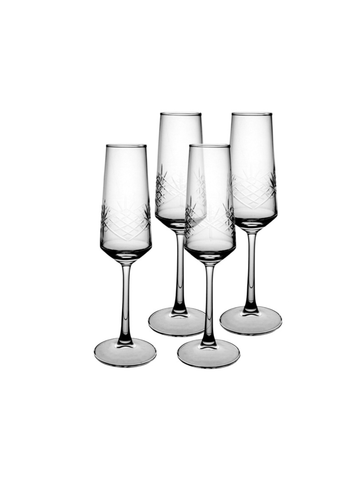 Elegance meets enchantment with our Hansen set of 4 flute glasses. Beautifully engraved starburst details make these stunning glasses shine in any occasion.
