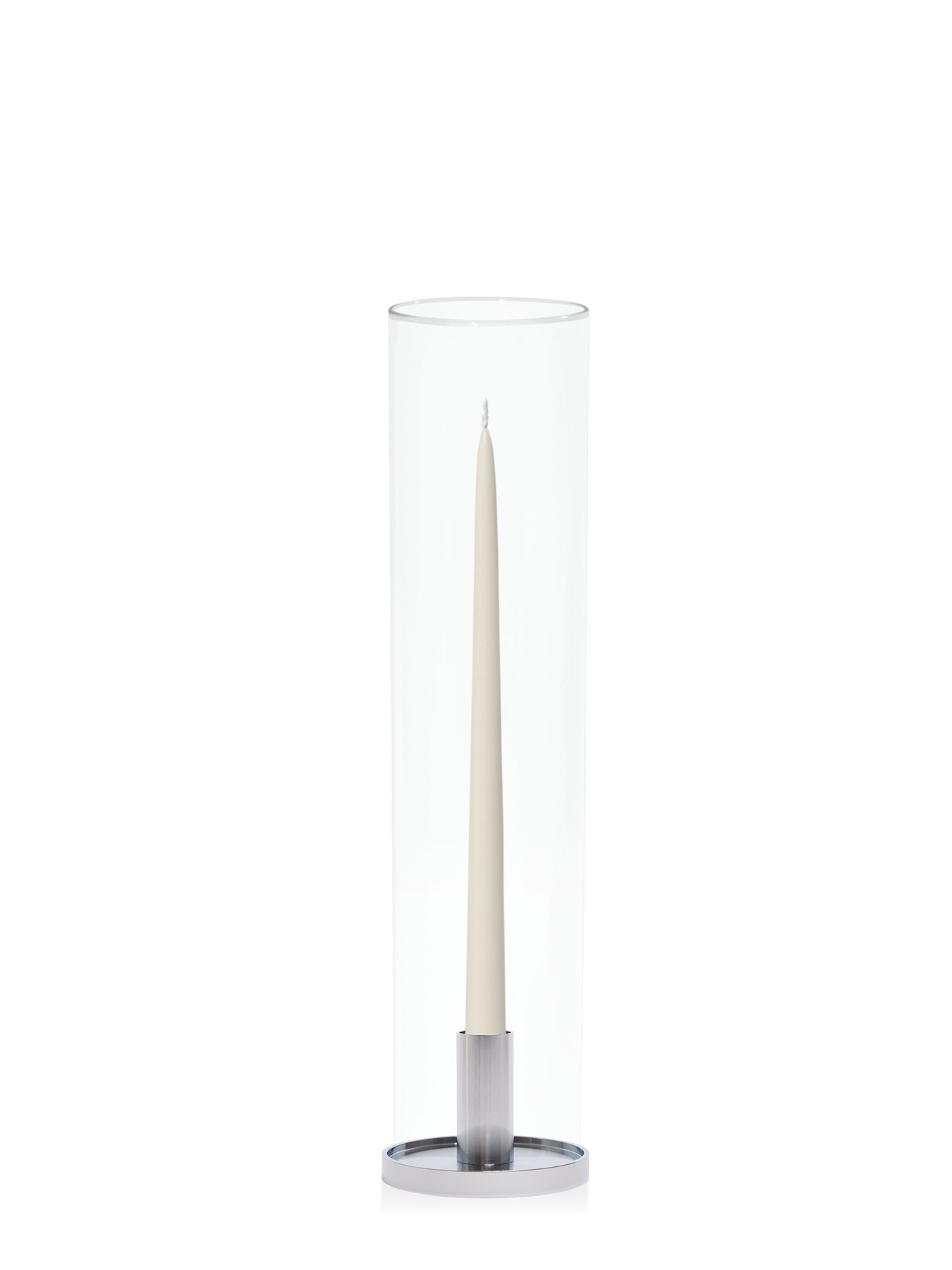Ivory 35cm Taper Candles with Medium Silver Maya Metal Holders and Glass Sleeves - Set of 12