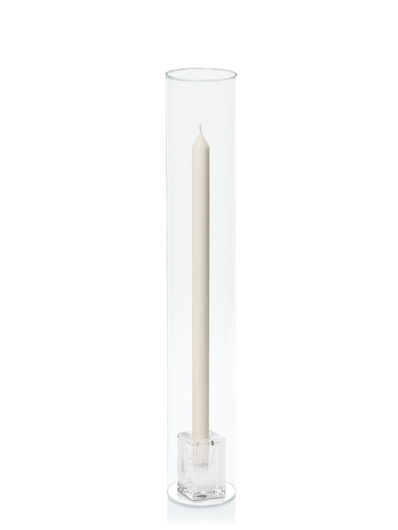 Ivory 40cm Dinner Candles with Glass Cube Holders and Glass Sleeves - Set of 12