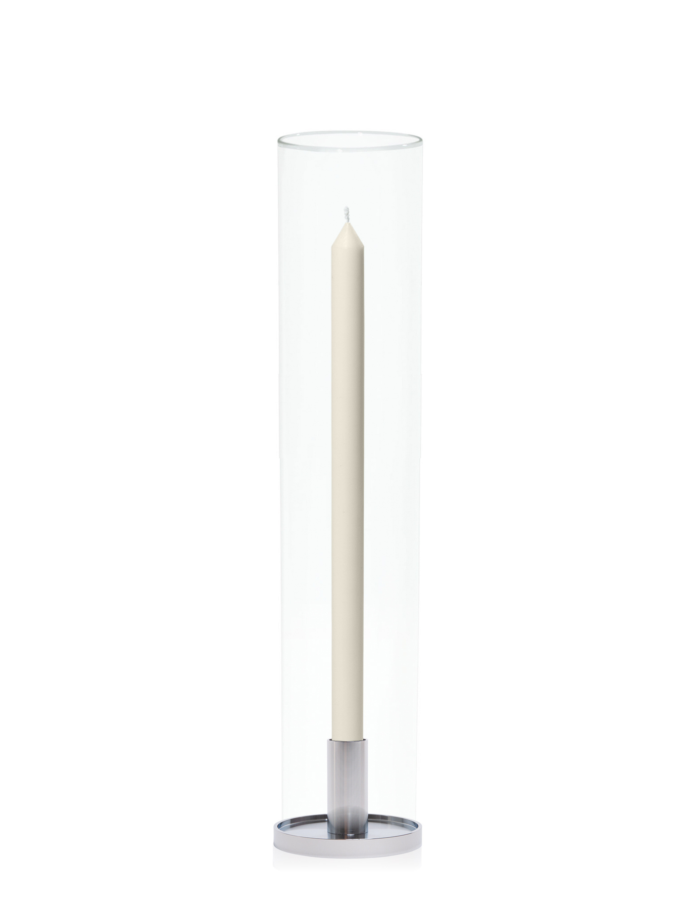 Ivory 40cm Dinner Candles with Medium Silver Maya Metal Holders and Glass Sleeves - Set of 12