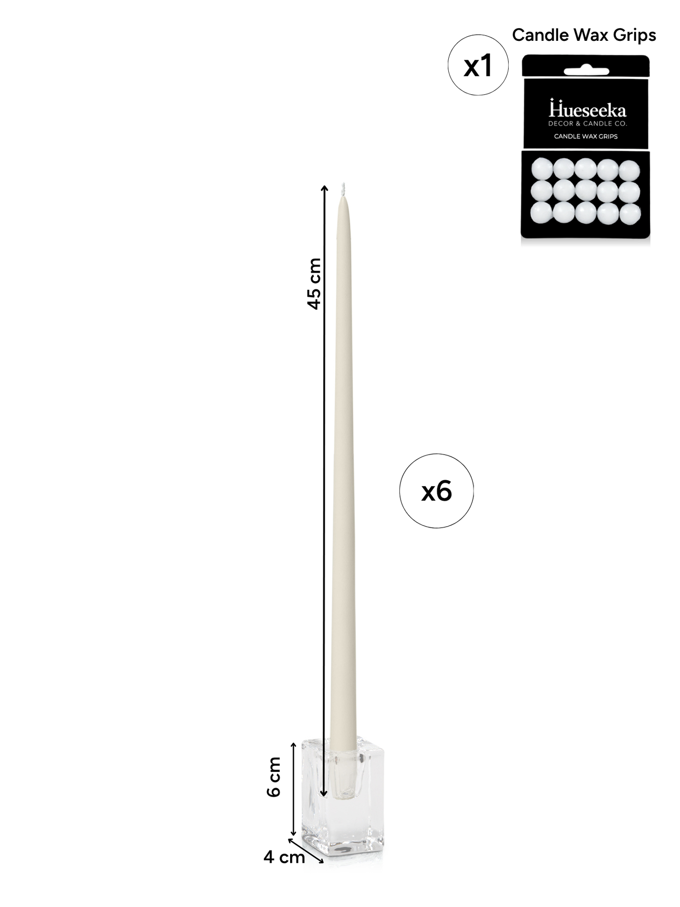Ivory 45cm Taper Candles with Glass Cube Holders - Set of 6