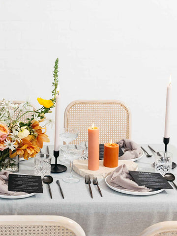 For events, elevate the ambience by clustering various heights of pillar candles in complementary colours on tables or along walkways for a sophisticated touch. At home, create a cosy atmosphere by arranging slim pillar candles in decorative holders on mantels or side tables, infusing your living space with warmth and style.