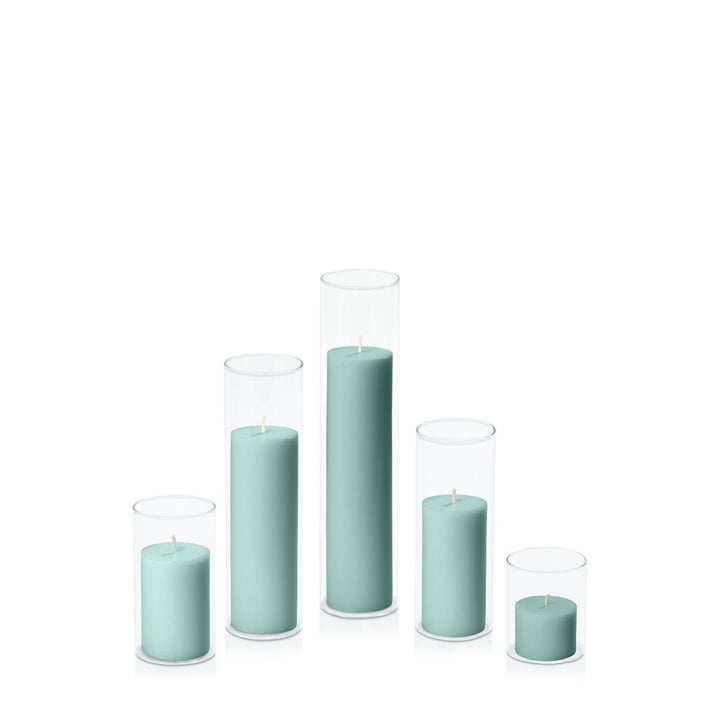 Sage Green 5cm Pillar in 5.8cm Glass Set - Sm