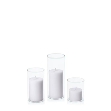 This Centrepiece Set features a trio of 5 cm wide unscented Pillar Candles, paired with 5.8 cm wide Clear Glass Cylinders. Together, they offer durability and longevity, providing a clean, enduring burn. With the candle securely encased within the glass cylinder, both flame and wax are safely contained for worry-free enjoyment.