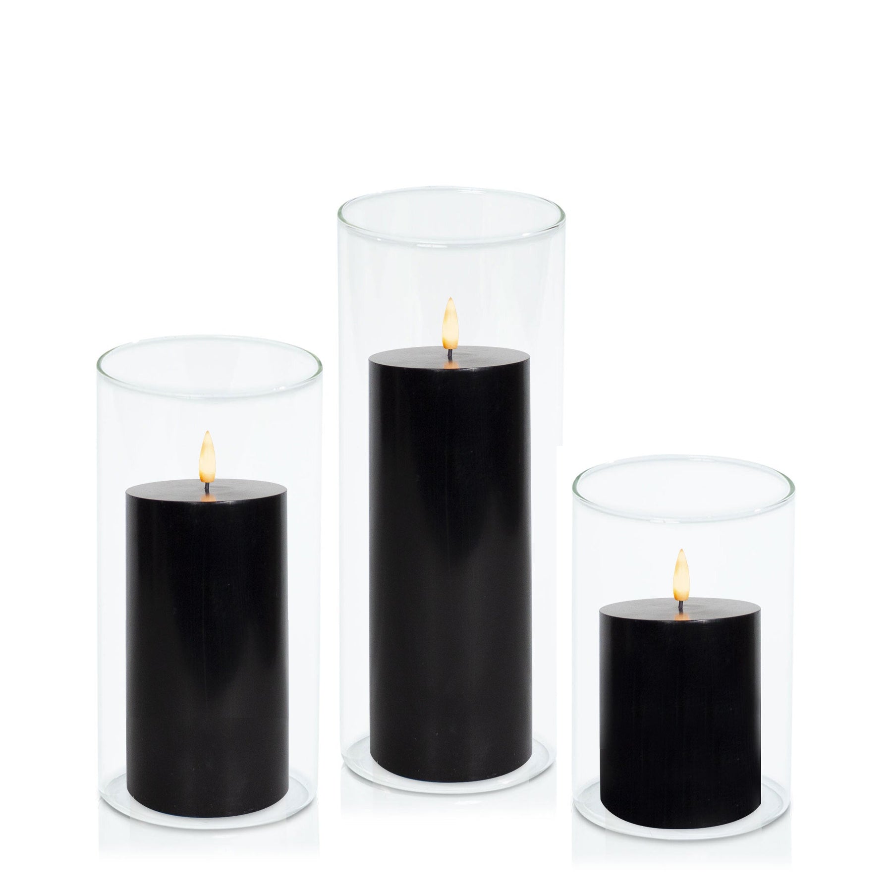 Black 8cm LED Pillar in 10cm Glass, Med - Set of 6