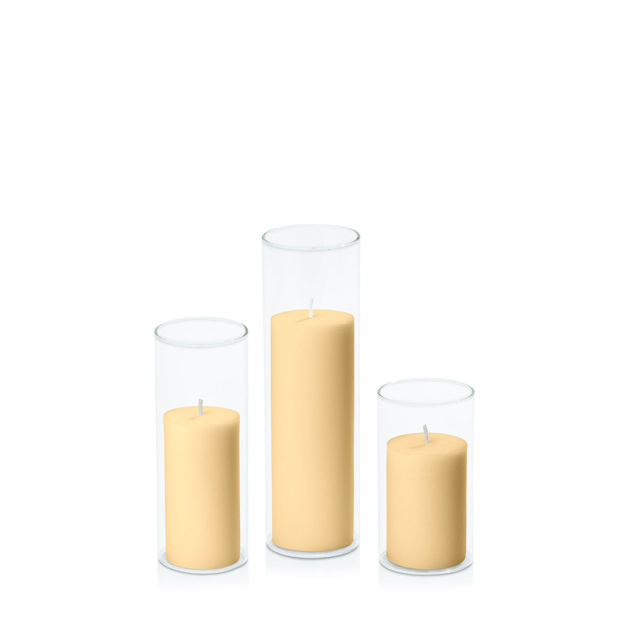 Enhance the atmosphere at events by arranging pillar candles of various heights in glass cylinders on tables or along walkways, adding a touch of sophistication. At home, curate a cosy ambience by placing this candle combo on mantels or side tables, infusing your living space with both warmth and style.
