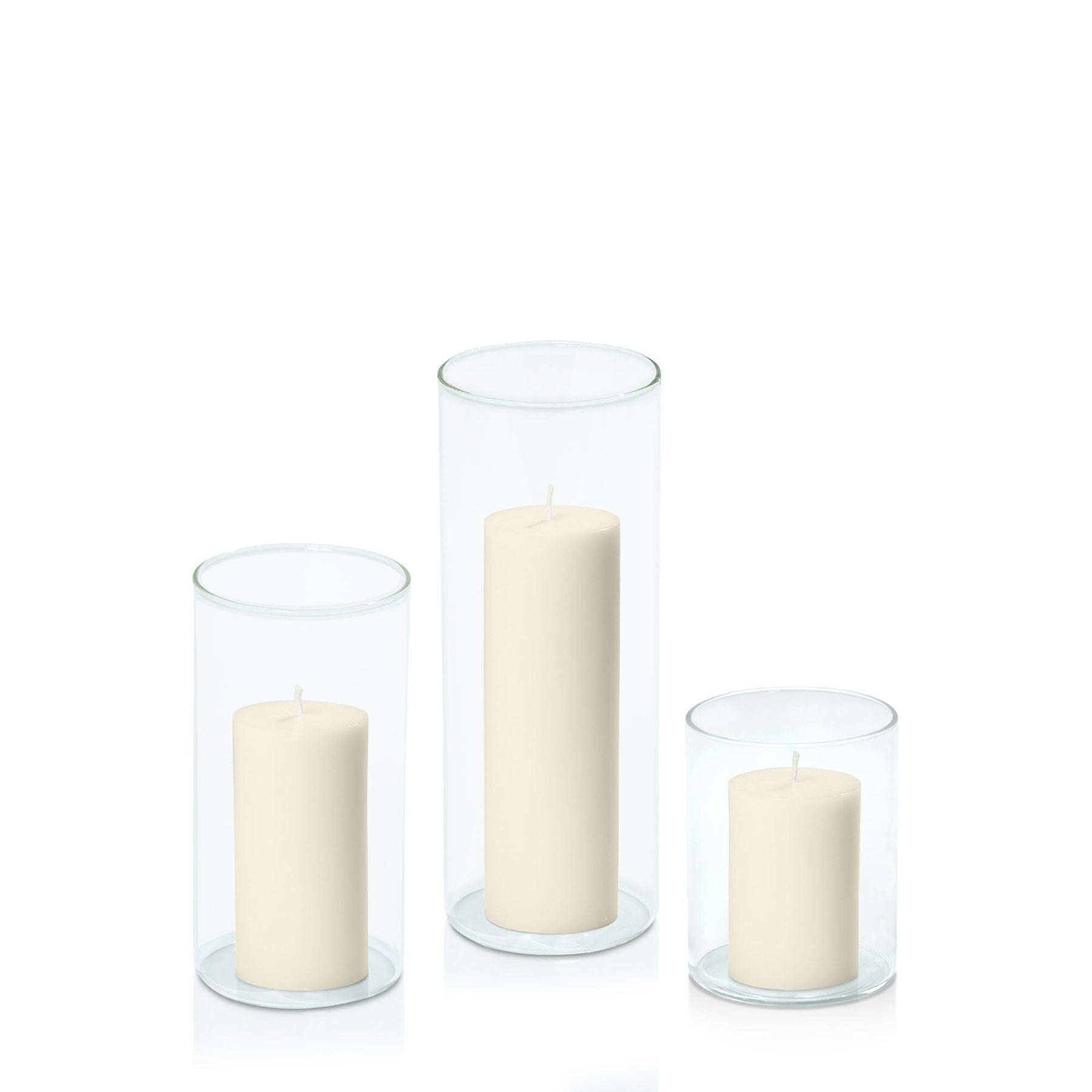 Enhance the atmosphere at events by arranging pillar candles of various heights in glass cylinders on tables or along walkways, adding a touch of sophistication. At home, curate a cosy ambience by placing this candle combo on mantels or side tables, infusing your living space with both warmth and style.