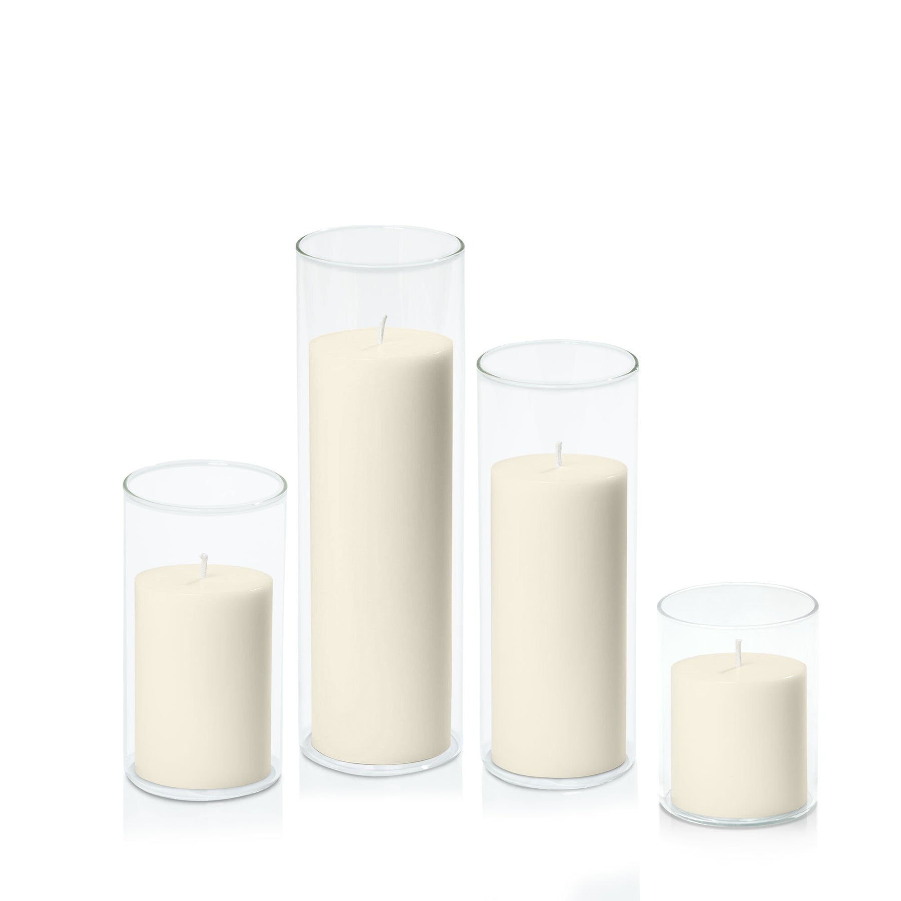 Enhance the atmosphere at events by arranging pillar candles of various heights in glass cylinders on tables or along walkways, adding a touch of sophistication. At home, curate a cosy ambience by placing this candle combo on mantels or side tables, infusing your living space with both warmth and style.