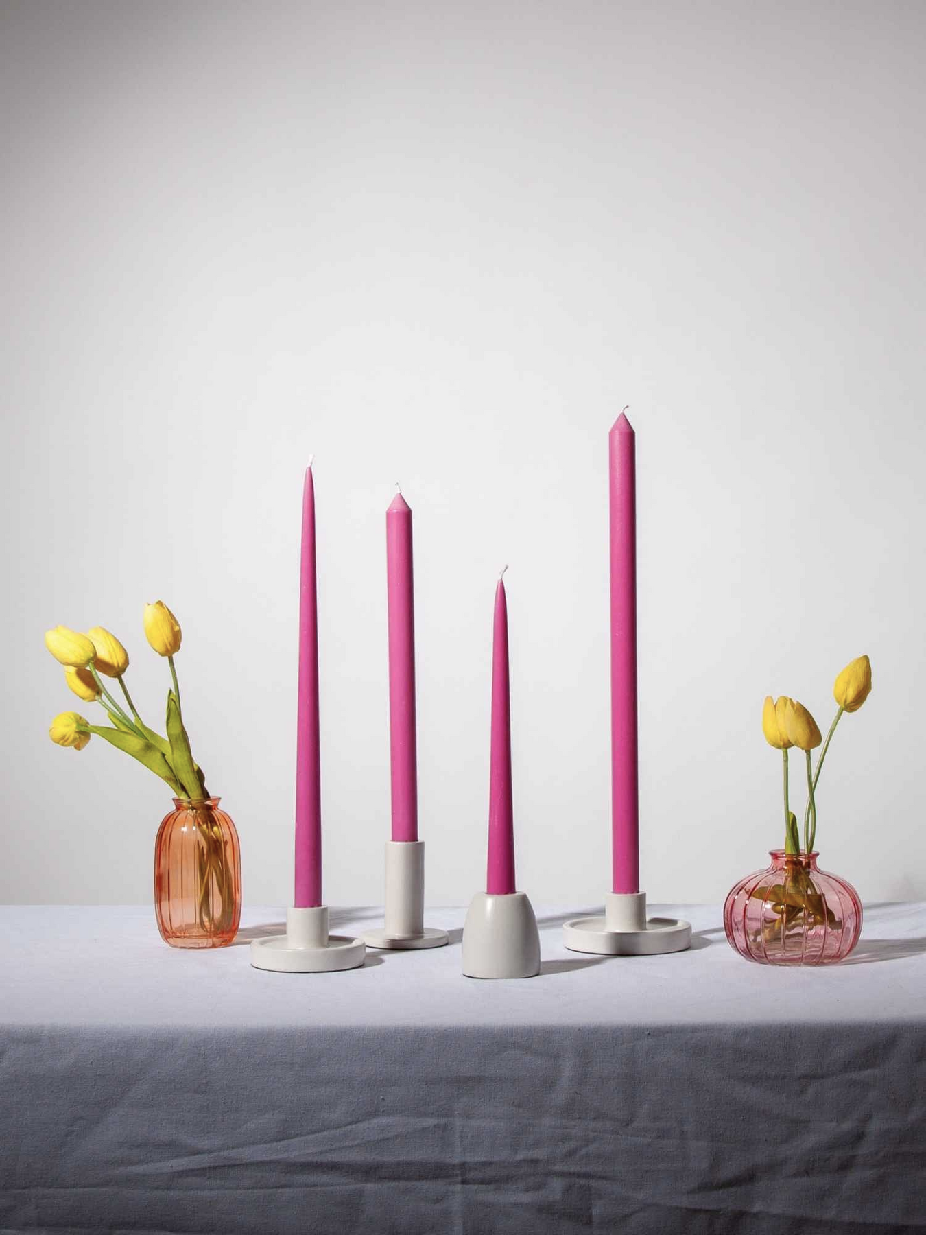 Maximise the visual charm of our Dinner Candles by effortlessly incorporating them into your dining experience. Combine them with our chic candle holders for a secure foundation and a hint of sophistication. Play around with various colours, sizes, and textures to craft a dynamic visual statement, or introduce an additional touch of refinement by integrating our glass sleeves.