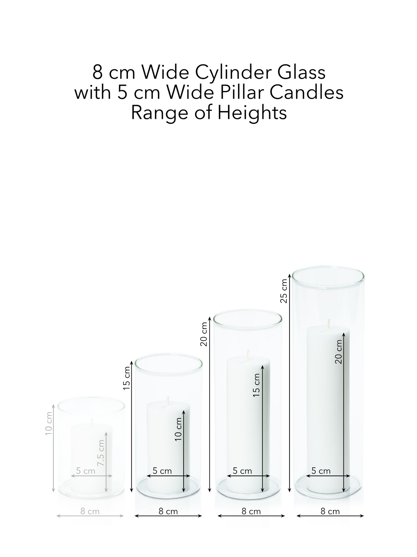 Enhance the atmosphere at events by arranging pillar candles of various heights in glass cylinders on tables or along walkways, adding a touch of sophistication. At home, curate a cosy ambience by placing this candle combo on mantels or side tables, infusing your living space with both warmth and style.