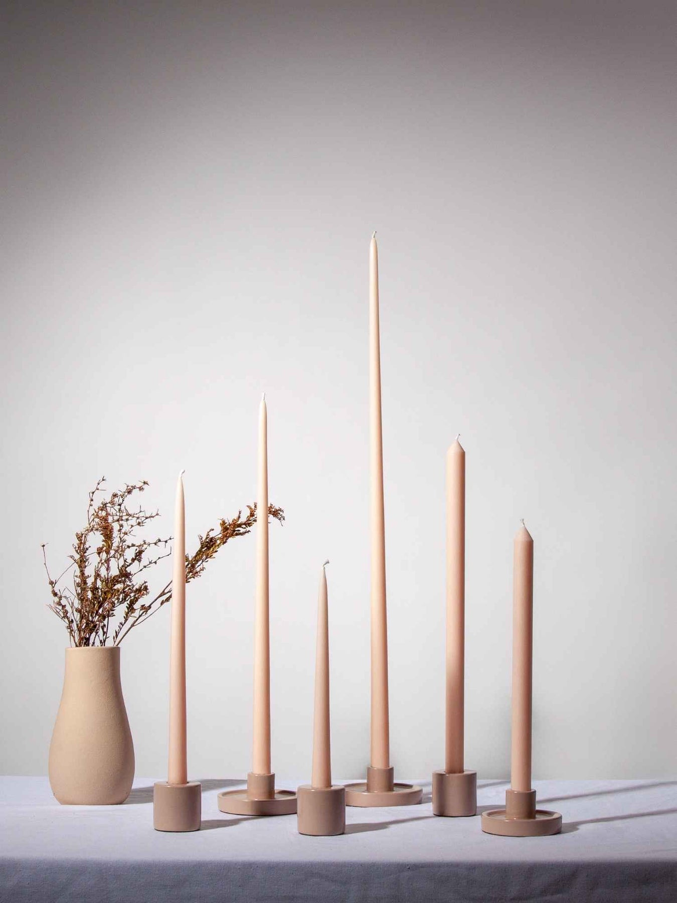 Maximise the aesthetic appeal of our Taper Candles by seamlessly integrating them into your decor. Pair them with one of our sleek candle holders for both a secure base and a touch of sophistication. Experiment with an array of colours, sizes and textures to create a dynamic visual impact, or add an extra layer of refinement by incorporating our glass sleeves.