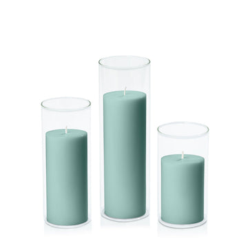 Sage Green 7cm Pillar in 8cm Glass, Med - Set of 6