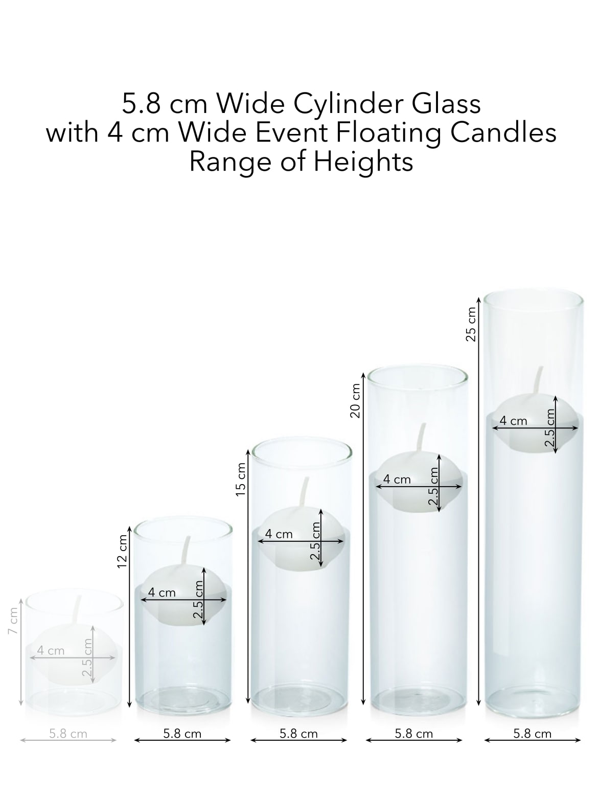 This Centrepiece Set includes four of our 4 cm Event Floating Candles, paired with 5.8 cm wide Clear Glass Cylinders. Together, they offer durability and longevity, providing a clean, enduring burn. With the candle securely encased within the glass cylinder, both flame and wax are safely contained for worry-free enjoyment.