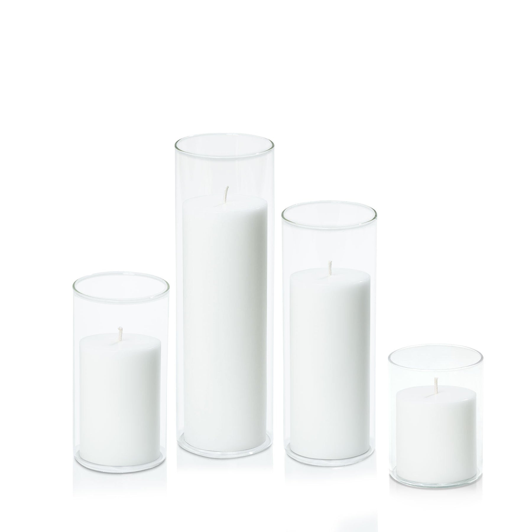 Enhance the atmosphere at events by arranging pillar candles of various heights in glass cylinders on tables or along walkways, adding a touch of sophistication. At home, curate a cosy ambience by placing this candle combo on mantels or side tables, infusing your living space with both warmth and style.