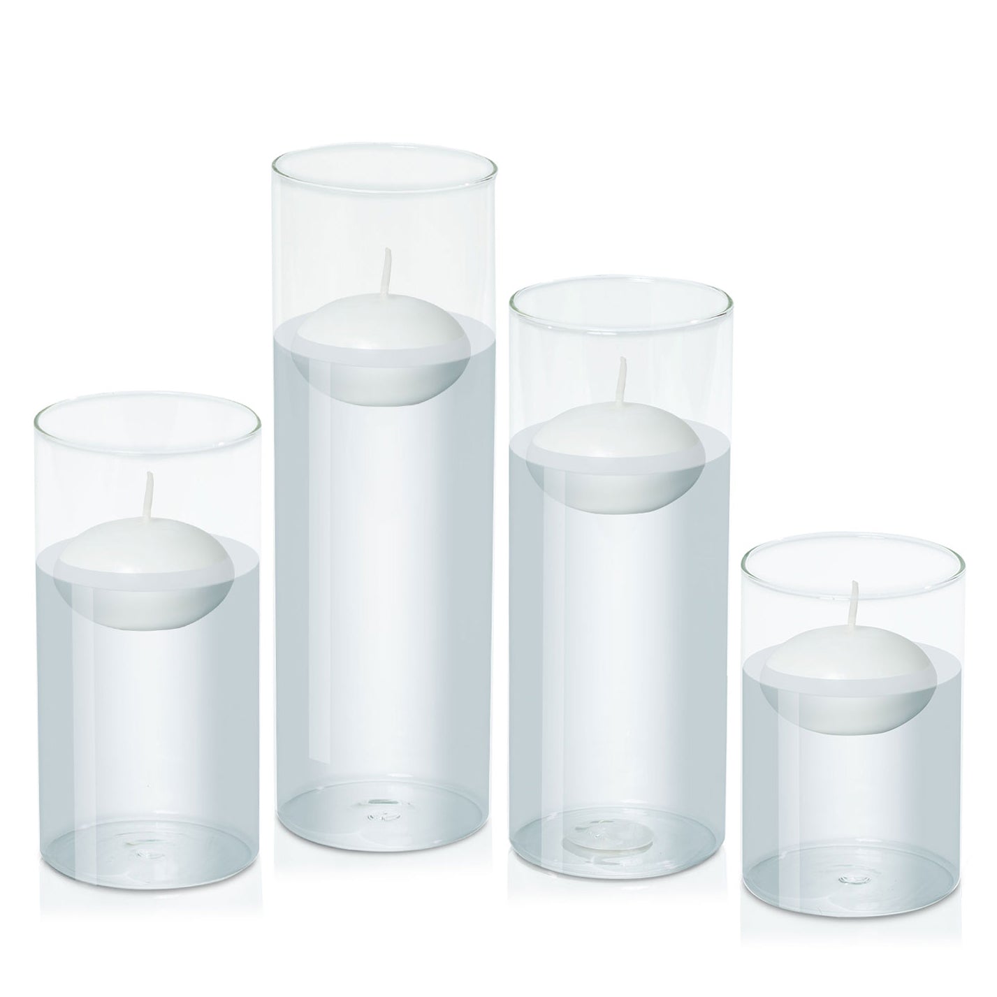 This Centrepiece Set includes four of our 8 cm width Event Floating Candles, paired with 10 cm wide Clear Glass Cylinders. Together, they offer durability and longevity, providing a clean, enduring burn. With the candle securely encased within the glass cylinder, both flame and wax are safely contained for worry-free enjoyment.