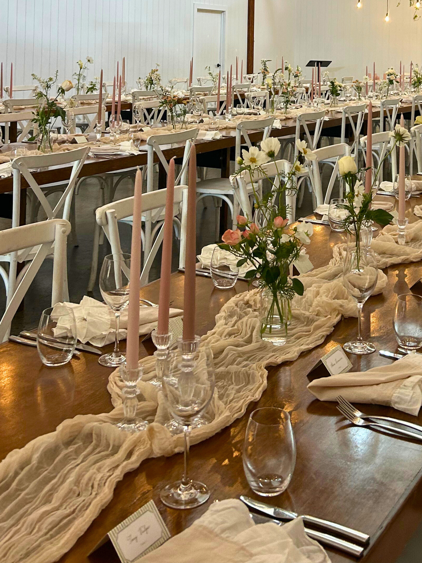 Our Cheesecloth Table Runners are designed to bring an airy elegance to weddings, events, and styled gatherings. Flowing effortlessly at 80 cm wide and 400 cm long, these oversized runners create soft, voluminous layers that drape beautifully across long tables or cascade gracefully to the floor.