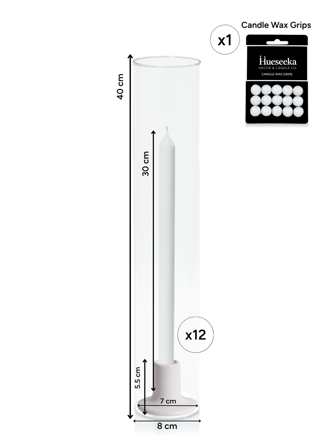 White 30cm Dinner Candles with Mona Ceramic Holder and Glass Sleeves - Set of 12