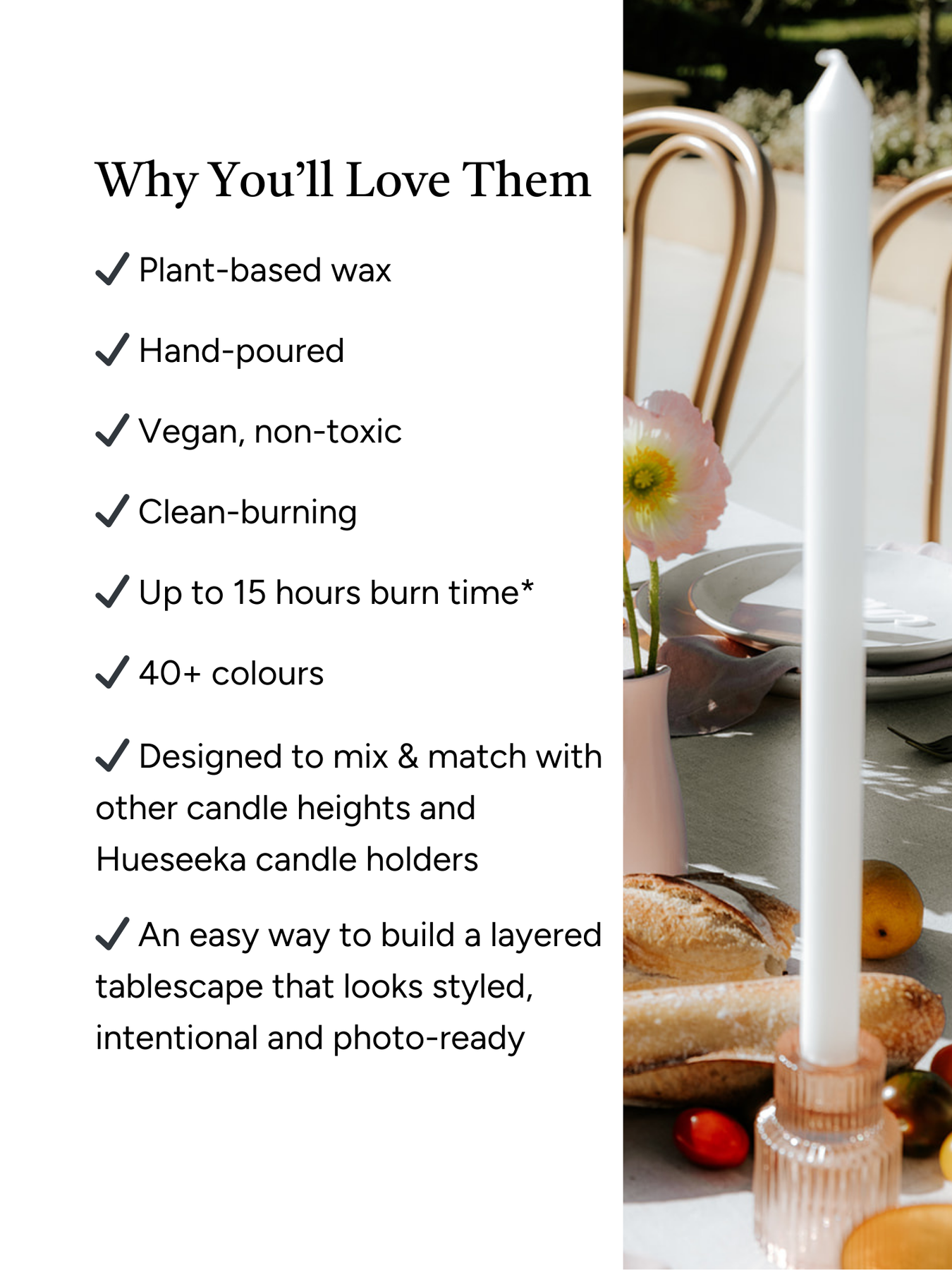 Maximise the visual charm of our Dinner Candles by effortlessly incorporating them into your dining experience. Combine them with our chic candle holders for a secure foundation and a hint of sophistication. Play around with various colours, sizes, and textures to craft a dynamic visual statement, or introduce an additional touch of refinement by integrating our glass sleeves.