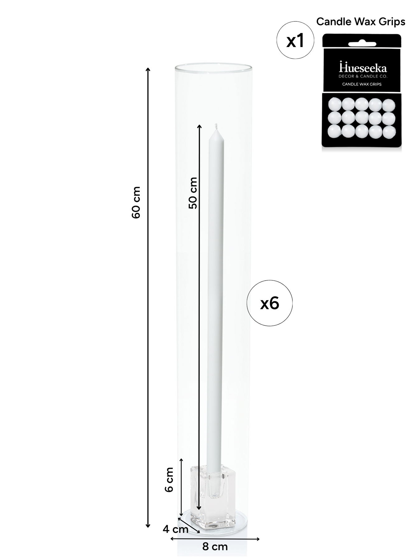 White 50cm Dinner Candles with Glass Cube Holders and Glass Sleeves - Set of 6