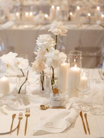 This Centrepiece Set includes four of our 5 cm width Event Pillar Candles, paired with 5.8 cm wide Clear Glass Cylinders. Together, they offer durability and longevity, providing a clean, enduring burn. With the candle securely encased within the glass cylinder, both flame and wax are safely contained for worry-free enjoyment.