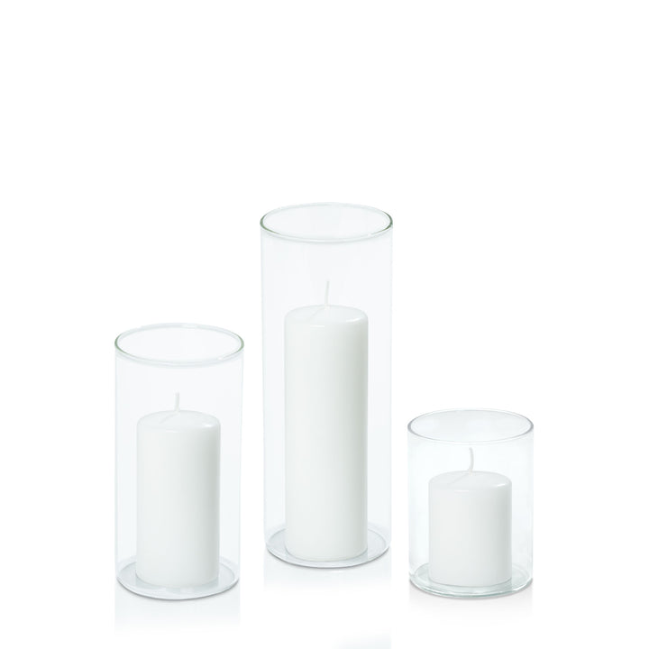 White 5cm Event Pillar in 8cm Glass Set - Sm