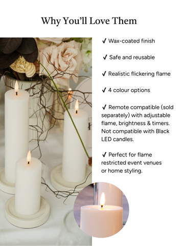 When burning a candle just isnt an option, our LED Candles provide a flameless alternative to create a luxurious candlelit ambiance. With their elegant design and warm glow, youll enjoy reliable, long-lasting candlelight perfect for both events and home décor. Designed with purified paraffin wax and an enchanting, natural-looking flickering flame.