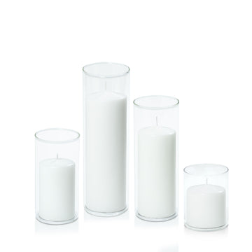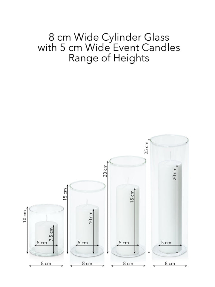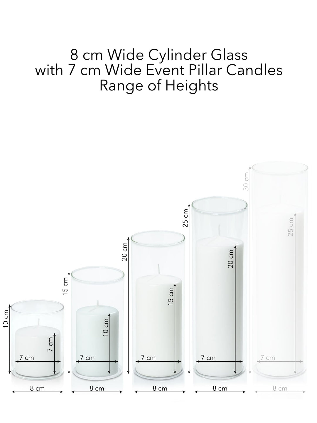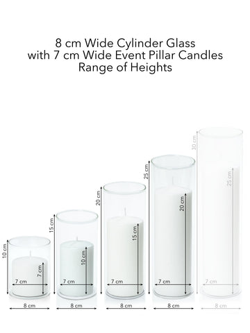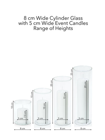 This Centrepiece Set includes four of our 7 cm width Event Pillar Candles, paired with 8 cm wide Clear Glass Cylinders. Together, they offer durability and longevity, providing a clean, enduring burn. With the candle securely encased within the glass cylinder, both flame and wax are safely contained for worry-free enjoyment.