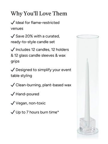 Nothing says romance like the soft glow of candlelight. This set of 12 taper candles with glass holders and sleeves is designed to transform your space with simplicity and elegance. Whether you're aiming for modern minimalism or classic charm, they’re the perfect finishing touch to frame your tables, illuminate your aisle, or enhance any corner of your celebration.