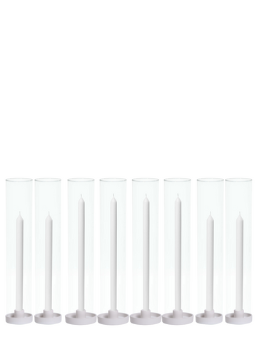 Total of 8 Dinner Candles, 8 Candle Holders and 8 Glass Sleeves.