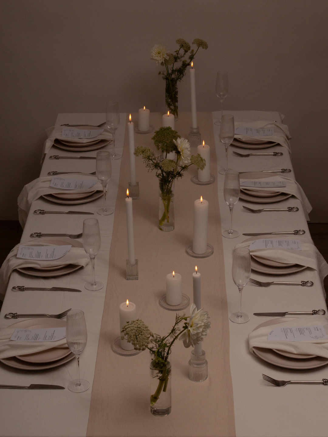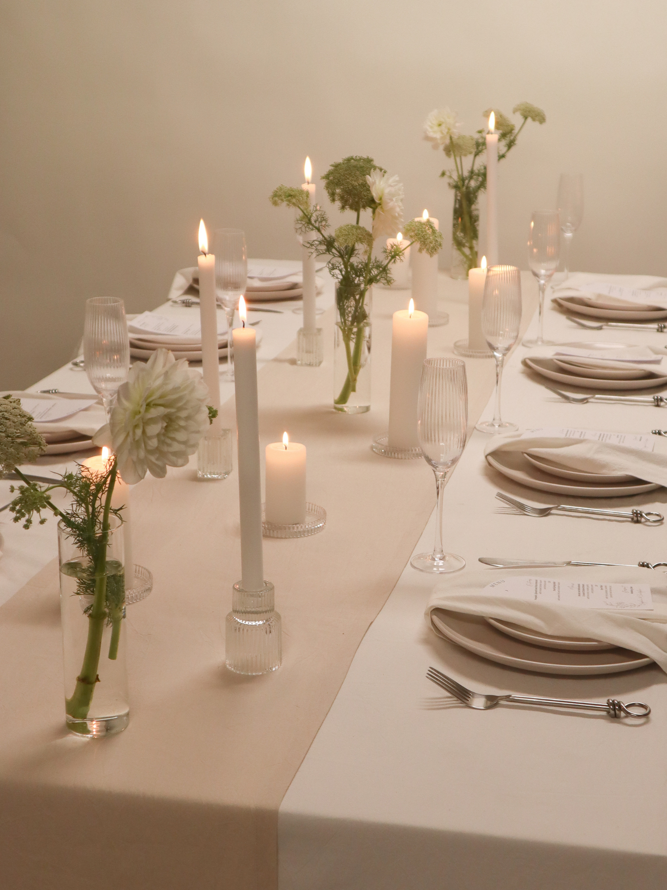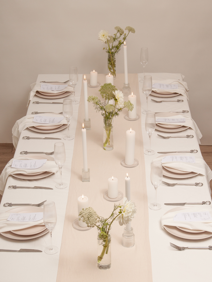 This wedding bundle is designed for a 2.4m long rectangle table, seating 8 guests (four on each side). To calculate, simply divide your total guest count by 8. (e.g., 80 guests ÷ 8 = 10 bundles). Consider your table layout and styling elements like floral centrepieces and bud vases — we suggest placing these every second chair.