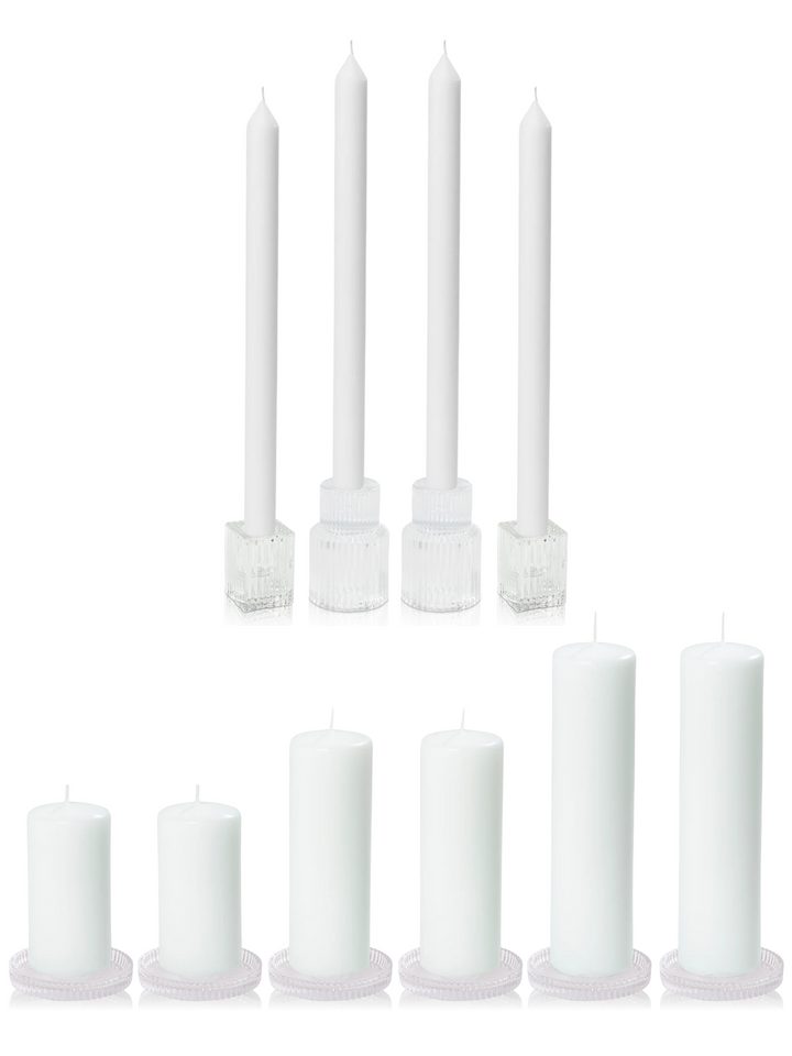 White Event Pillar & Dinner Candles with Holders Wedding Bundle