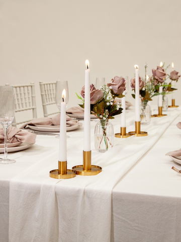 Make a statement with the subtle luxury of candlelight and gold. This set of 12 dinner candles with sleek metal holders is perfect for creating an elevated, sophisticated atmosphere. Style them down long tables, frame your ceremony aisle, or scatter them throughout your space for a warm, romantic glow with just the right touch of elegance.